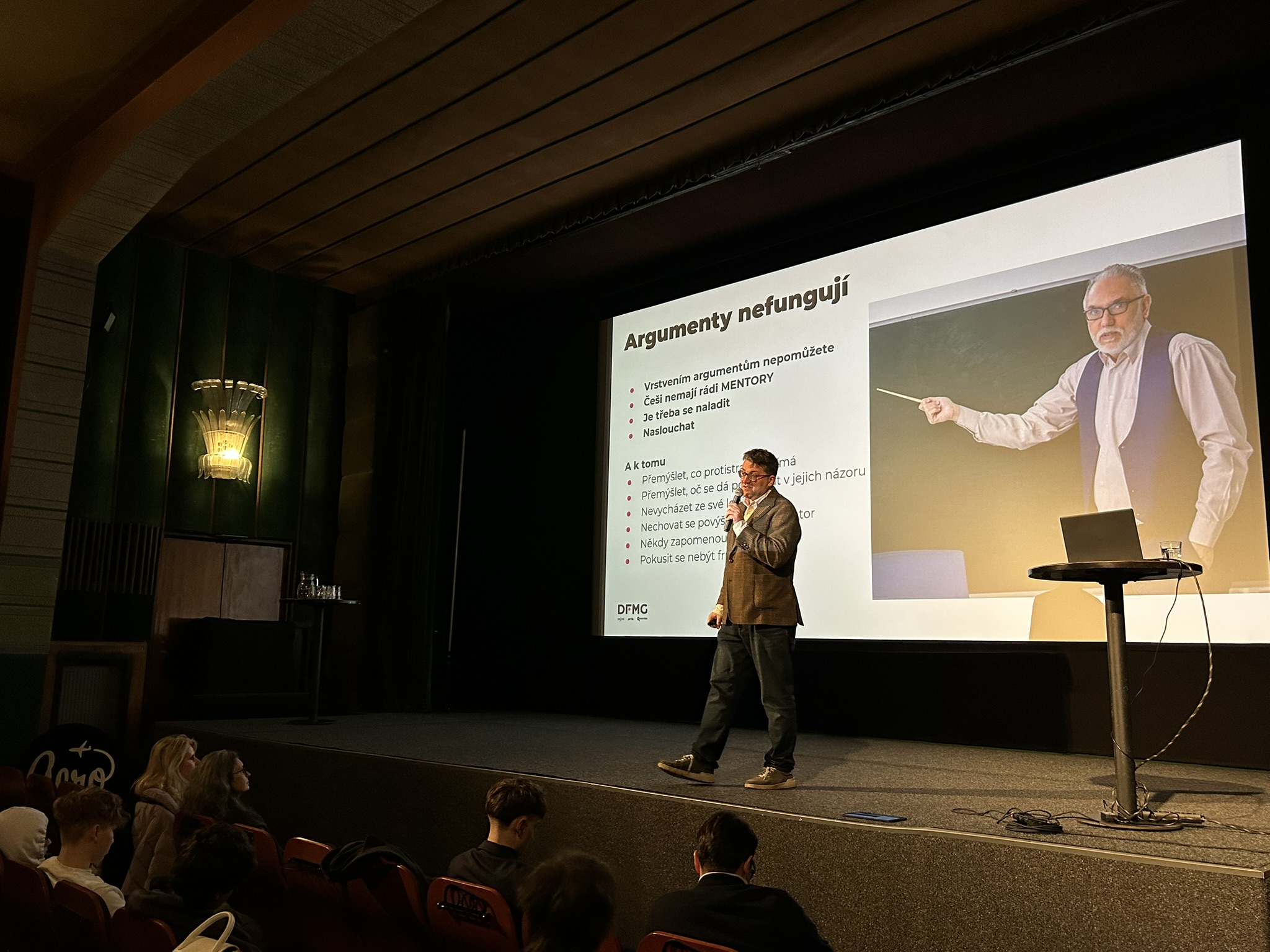 První z hostů byl Tomáš Jindřišek, Managing Partner skupiny digitálních agentur DFMG. Dlouhodobě se věnuje marketingové komunikaci a vedle své profesní kariéry se aktivně zapojuje do projektů s pozitivním společenským dopadem. Ve svém vystoupení studenty inspiroval k prospěšnosti a mluvil o tom, že skutečná změna často začíná u jednotlivce a že i zdánlivě malé kroky mohou mít dlouhodobý smysl.
