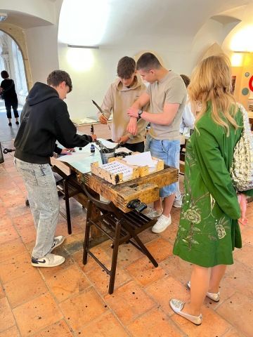 V dolních prostorách galerie, kde je připraven malý workshop, si mohli vyzkoušet psát pírkem, sestavit gotickou klenbu a vytisknout reliéf gotické rozety. Vyučující výtvarné výchovy, Jitka Stolínová, je úžasnou kreativné osobností, jež propojuje své hodiny umění s historií.